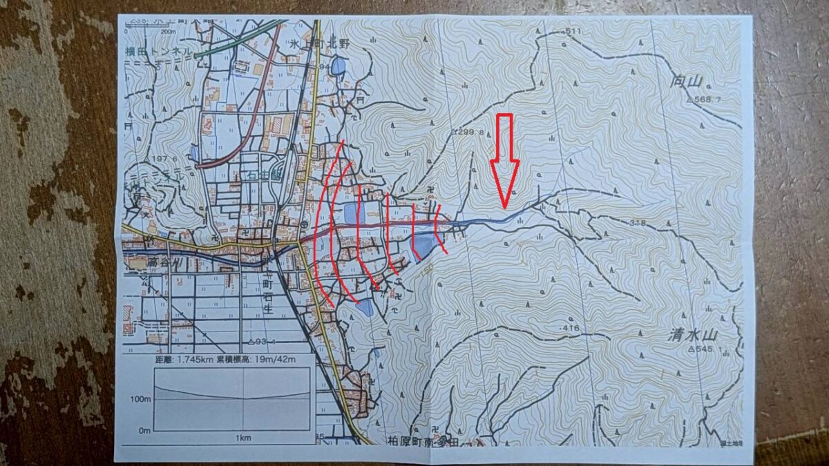 実際に分水嶺になっている地点に到達。周囲を等高線の地図で見てみますと、山の尾根は等高線が突起状になって連なっているところがそうで、石生一帯はなだらかな等高線が続くことからいわゆる扇状地となっていて、これは雨が降って水が流れるルート(水と一緒に土砂も流れていくことで地形が作られていく)でそうなっているとのこと。